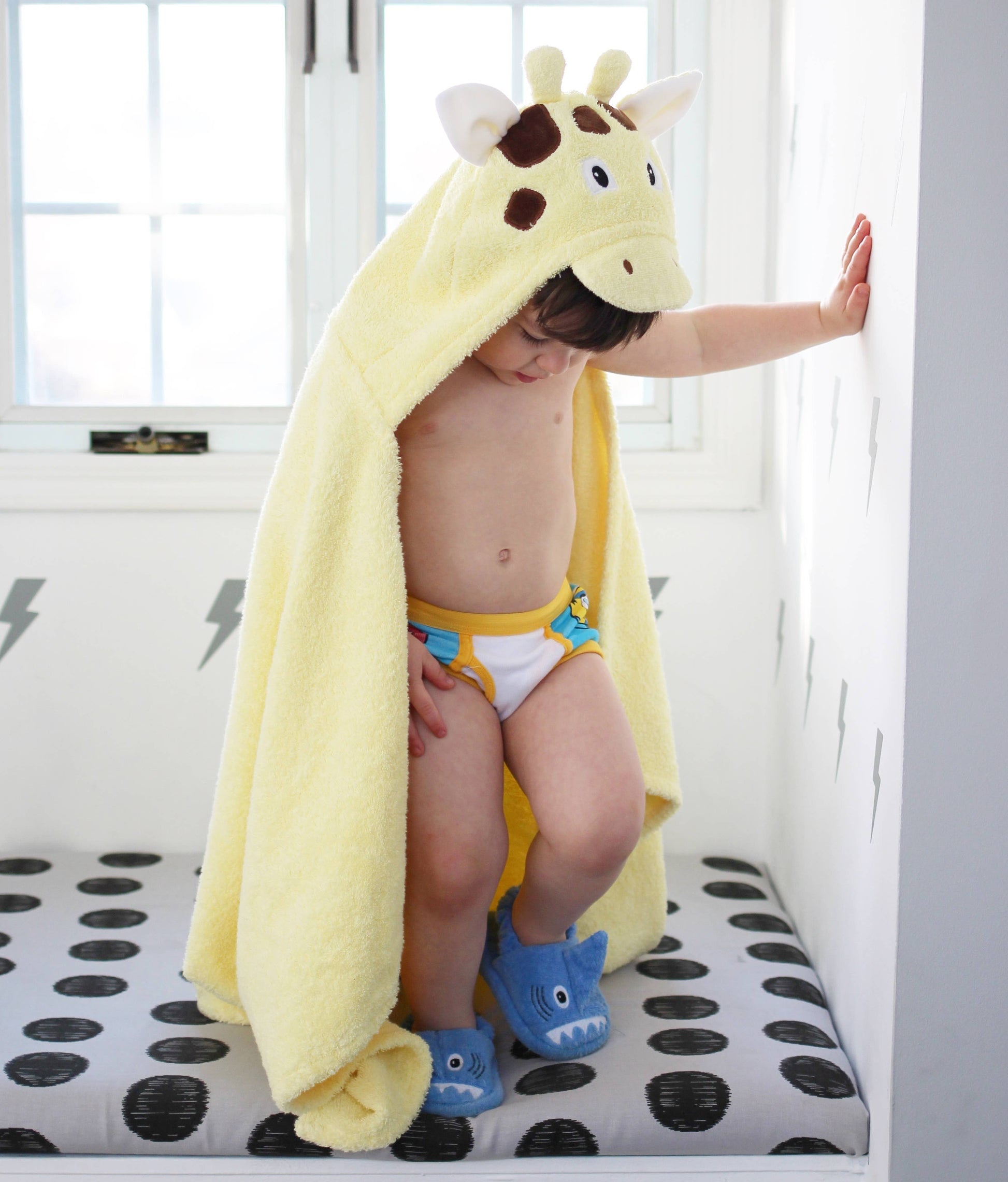 Inspired by a safari, I added the bright yellow, sweet Giraffe to my line. It has super soft brown spots, a cute little nose that doubles as shade when you're out at the pool or beach, a smart little tail, for detail, and is crafted from soft 100% cotton terry to keep you snuggly and warm after your swim or bath. Our giraffe hooded towel is a great gift for boys or girls.