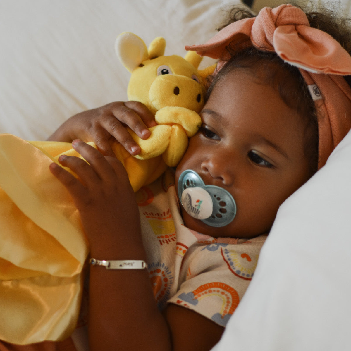 The newest member of our lovey family is this adorable little Giraffe. It's hands are holding its own little edge of the blanket and has embroidered eyes and super soft brown spots. This giraffe lovey blanket is made of a super soft minky fabric and is a great unisex gift for any new baby or toddler. Children use these blankets for comfort and security at naptime, and they are also great to take on outings because of their compact size and the combination of a doll and a blanket together in one. Perfect for a baby shower gift, or a birthday gift for a toddler. They're so soft and cuddly! -20"x 20" -made of a super soft minky-like fabric -double thickness, with a satin edging -100% polyester fiberfill in the Giraffe -crinkle material in the Giraffe head -machine washable